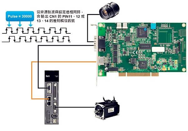 PCI-DMC-B01 直接在軸卡的硬件上,提供了用戶兩組實時性的脈沖擷取功能。經由DLL 動態鏈接庫,可以靈活的整合出脈沖的比較功能,并且在等間距或不等間距的脈沖位置對攝影機進行快門的觸發、拍照。